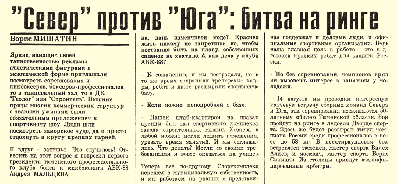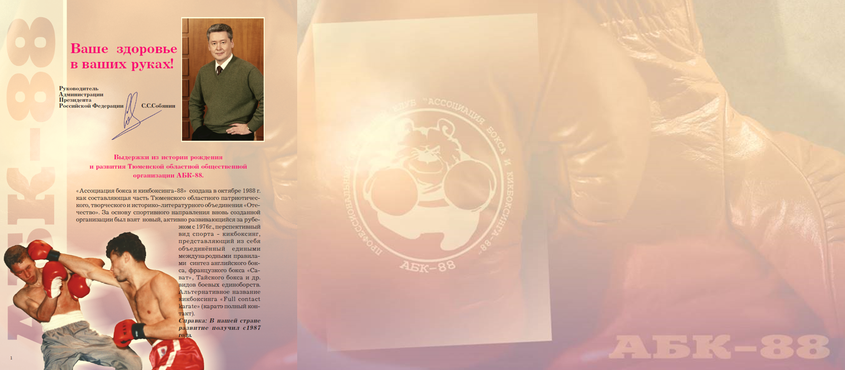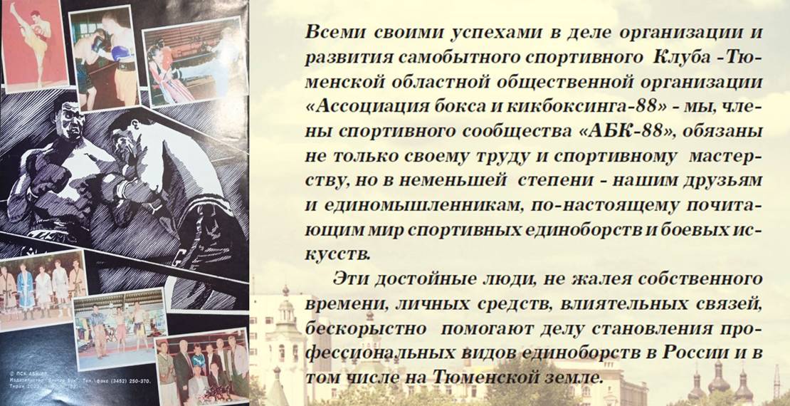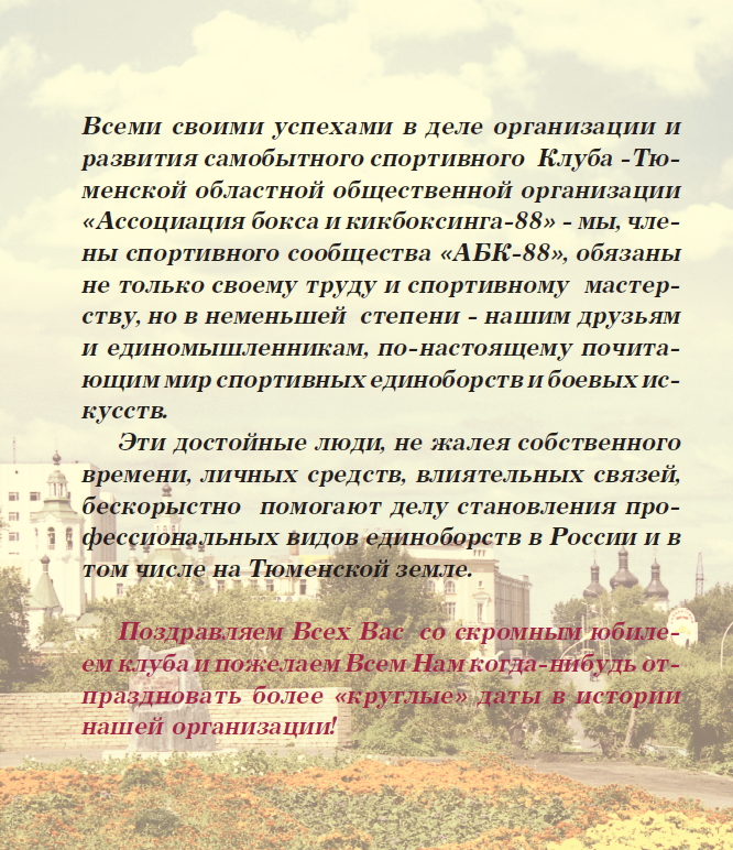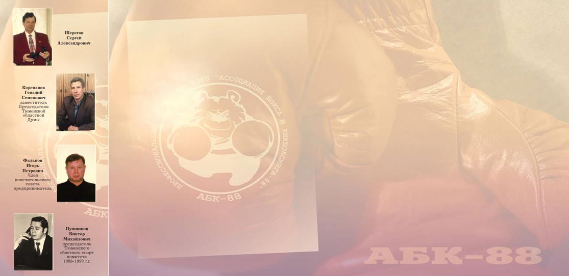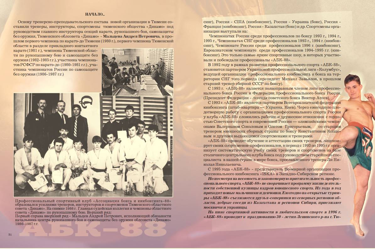 МАЛЬЦЕВ АНДРЕЙ ПЕТРОВИЧ. Основатель и избранный руководитель – профессионального спортивного клуба и Тюменской областной одноимённой общественной организации «Отечество - Ассоциация бокса и кикбоксинга – 88» (с 1988 года по 2013 год) и лидер общественного объединения без образования юридического лица – «Клуб Отечество – АБК – 88» по настоящее время!
