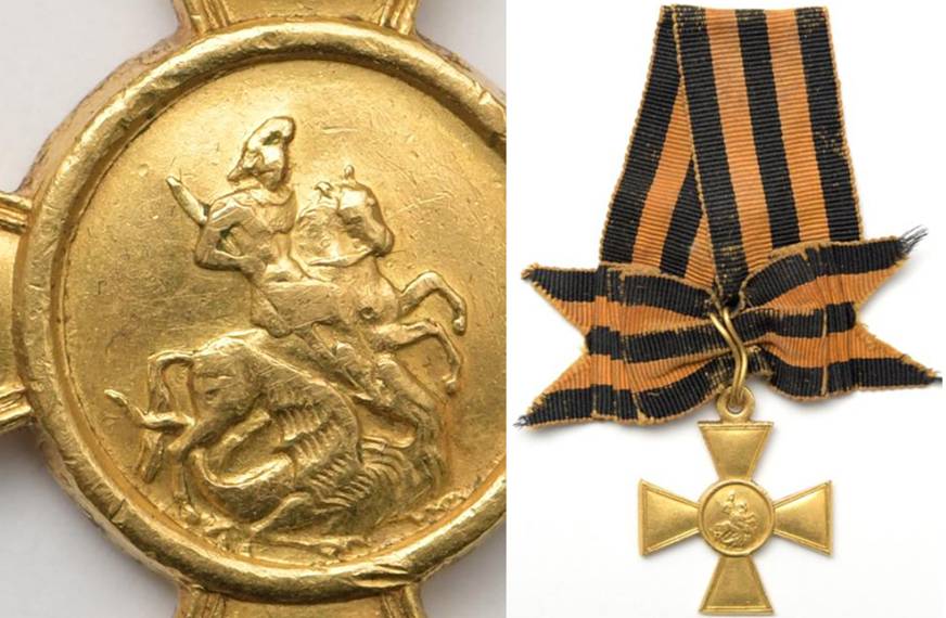 Описание Георгиевского креста 1 ст. № 4549. Описание: золото, вес - 14,48 гр., размеры - 40,9 х 34,4 мм., Петроградский монетный двор, 1914 г., бант в оригинальном сборе, материал исполнения - шёлк, муар. У оригинального Георгиевского креста, серебра или золота, высокое качество металла - из-за практического отсутствия сплавов (всего 1% меди). "Ни высокая порода, ни полученные пред неприятелем раны не дают право быть пожалованным сим орденом, но даётся оный только тем, кто отличил себя особо мужественным поступком".