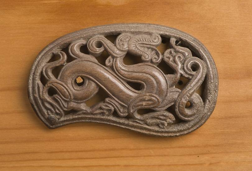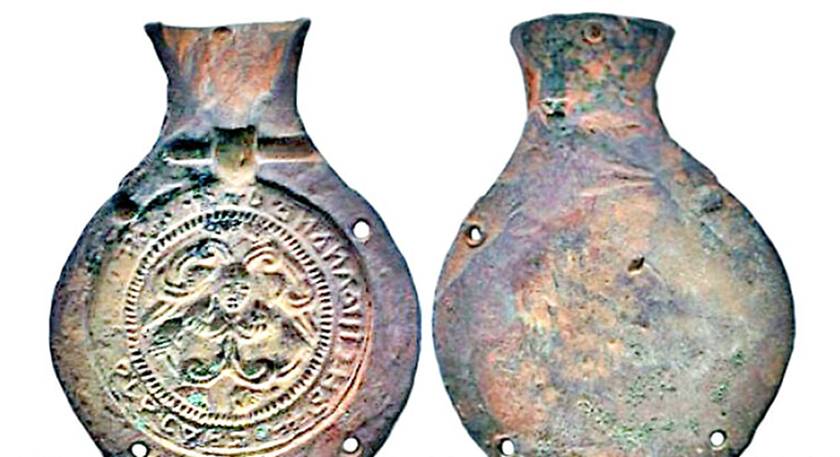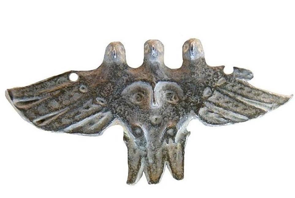 Следует отметить, что несмотря на редкость, найдено достаточно большое количество сюжетных медальонов - отлитых в бронзе, хотя и известны и вырезанные из благородного камня (кровавой яшмы – например). Половина формы для отливки подвесного нательного медальона». Сторона композиции с грифонами и сопроводительной надписью. Размеры: 72x53 мм. Время 11-13 вв. Подобные композиции на территории Руси встречаются чаще, чем в иных землях. Следует сказать и о том, что сами условия нахождения матриц в земле в течении многих столетий преподносят находчикам сюрпризы, порой приятные, когда состав почвы способствует отличной сохранности предметов, и не очень приятные, когда окислы губят уникальные вещи.