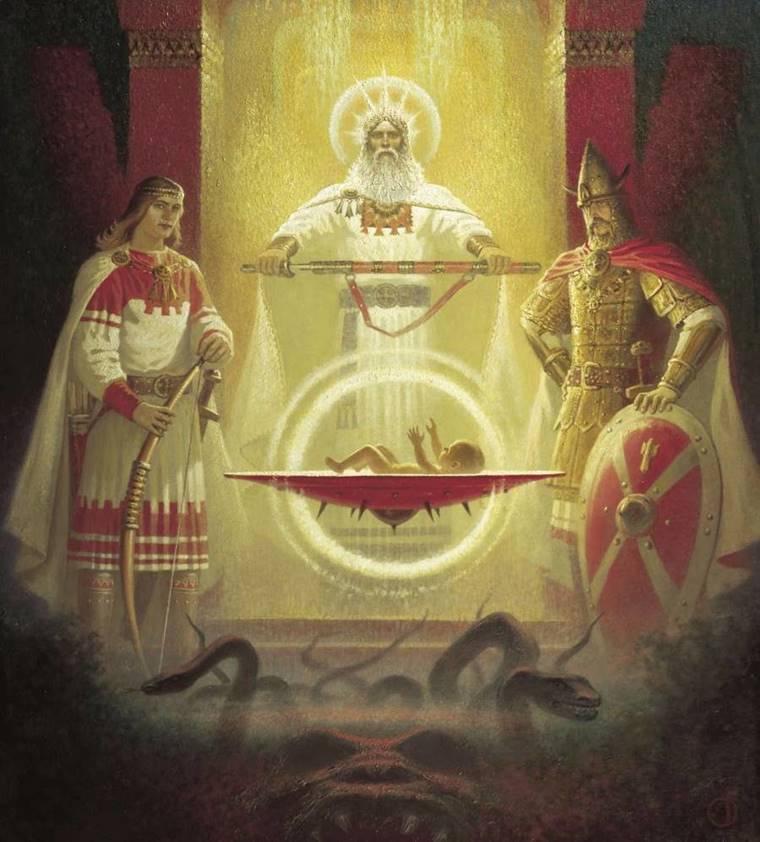 Осознанная тветственность национального Героя – Лидера (царской крови) – и заслуженных в поколениях лучших бояр РОДА - за благополучие своего ВИДА – языка - народа. Есть коллективное безсознательное, которое оперирует архетипами и оно, безсознательное - лежит вне разума – то есть – интуитивное непознаваемое присутствие и полностью неизъяснимый принцип - в мифологии людей Расы – на первоязыке - Жив – Див – БОГ (на санскрите – Бха). У любого значимого народа - тем паче создающего вокруг себя собственную цивилизацию основанную - именно на архетипах и ментальных конструкциях - есть свои изначальные архетипы. Назвав Русов - руских «интуитивно-этическими интровертами», Юнг хотел сказать, что они обладают особыми способностями к предчувствию и развитой интуицией, что жизнь они воспринимают чувственно. Причем чувственное отношение к жизни может выражаться в крайних формах, и не случайно многие отмечают максимализм Руских людей. Им тяжела, даже ненавистна повседневная рутина, «мелочность», излишняя размеренность жизни, т.е. все то, что для западного человека является нормой и основой жизни. Они же от такой «нормальной» жизни, как признаются сами, «хиреют», впадая в тоску и депрессию. Для Руских людей - очень важна внутренняя (душевная, духовная) сторона жизни. Порою она даже важнее, чем материальные вещи. Не случайно в их жизни (и в языке) такую важную роль играет понятие «душа». В других языках «душа» – это нечто эфемерное, что покидает тело после смерти. Для Русов - руских же это нечто материальное, как нить, связующая каждого человека с остальными его сородичами. Она может болеть, даже если «денег куры не клюют», гореть, подсказывать, обливаться слезами, ей может быть тяжело или легко, она может петь по утрам, быть нараспашку и т.д. Люди с «типично Руским характером» - часто воспитатели, двигатели культуры, мечтатели, мыслители - склонные к мистике, иррациональные фантазеры – но в то же время изобретатели нового – конструкторы – двигатели прогресса – первооткрыватели - творцы – при необходимости становящиеся непобедимыми воинами. Способность ощущать невидимый, но реальный мир существования электромагнитных излучений в виде волн в фотонном пространстве Белого Света Вселенной - это великий дар или БЛАГО, данное каждой живой сущности для познания параметров и свойств окружающего нас мира. Дар ощущения параметров внешней среды служит основой обретения знаний. Чтобы жить, руководствуясь этими знаниями, надо уметь сохранять в памяти эти знания, что приводит к способности собственно мыслить, оперируя в разной комбинации накопленными знаниями. Поэтому великое БЛАГО – это способность самому мыслить и поступать (творить) сообразно собственному мышлению. Сознание – это тело мысли или тело Демиурга вселенной, разума творения, как угодно, оно пребывает в нашем теле - и оно есть дар творца каждому, потому что именно с его помощью мы меняем свой мир и мир вокруг себя.