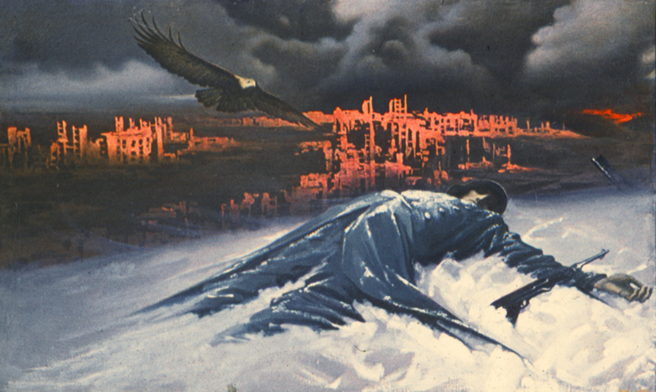 «Та страна, что могла быть раем, Стала логовищем огня, Мы четвертый день наступаем, Мы не ели четыре дня. Но не надо яства земного В этот страшный и светлый час, Оттого что Господне слово Лучше хлеба питает нас. И залитые кровью недели Ослепительны и легки, Надо мною рвутся шрапнели, Птиц быстрей взлетают клинки. Я кричу, и мой голос дикий, Это медь ударяет в медь, Я, носитель мысли великой, Не могу, не могу умереть. Словно молоты громовые Или воды гневных морей, Золотое сердце России Мерно бьется в груди моей. И так сладко рядить Победу, Словно девушку, в жемчуга, Проходя по дымному следу Отступающего врага.»