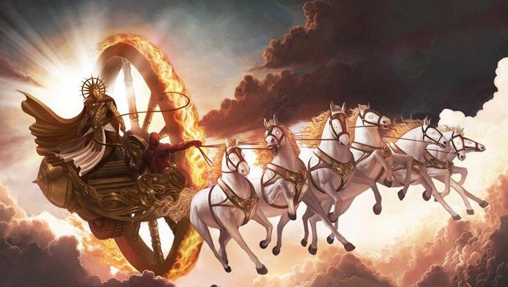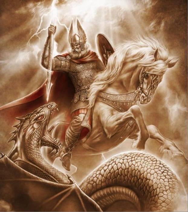 В основе древнего Ведического мировоззрения - Индра верхом на Единороге олицетворяет Творца Жизни, власть которого распространяется от Земли до Неба. В Риг-Веде Индра есть величайший и высочайший среди Богов, и то, что он пьёт напиток Сома, указывает аллегорически на его (высоко - духовное) естество. Он победитель всех «врагов Бога», Даитьев, Нагов (Змий), Асуров, всех Богов-Змиев и самого Вритра, Космического Змия. Индра – отождествляется – как РУДРА. Рудра — это необузданная и непроявленная невидимая сила, обладающая знанием и безсмертной мудростью. Индра - Рудра - драконоборец. Он предстаёт в виде воинственного бога-громовержца, царственного полководца и сокрушителя препятствий. В "Ригведе" этим "драконом" был змей Вритра, который разложил свое хладнокровное тело так, что перекрыл реки. (Видимо ледник). В начале ведического периода (Риг-Веда) Индра - Рудра - был верховным богом, создавшим Солнце, освободивший Зарю (Сурья, рассвет). Затем - Индра сам стал - солнечным божеством, ездил по небу на белых конях, запряжённых в золотую колесницу. (Риг-Веда. 3.3.3). Ярило - КОЛО - Солнце – Сурья - глаз Бога Индры, а его брат-близнец Агни (PB VI 59,2). Руское оГоНь на санскрите – аГНи. Здесь руское слово первично. Что касается родственных связей, то отцом Агни является сам Брахма. Согласно древнейшим верованиям РАСЫ, Агни является творящим «аргументом», что живёт в сердце каждого разумного человека. (М.А.Й. я – Матерь Агни и всех гоев - Йогов). В Ведах местами ещё можно встретить указание, что свастика – это изначально знак бога Агни, бога огня. И это был первый ведический бог со свастикой. В дальнейшем им означены были все главные индийские боги. Из «Риг-Веды» молитва 9 – к Огню – Агни: *sa-cas-va na? svastaye — са-кас-вай на свастяе = со-про-вождай нас-на счастье (на благо.) В некоторых стихах Риг Веды (Гимн 3.1.3), бога Агни называют Красным Туром, который выделяется среди тёмных быков, тёмных сил Зла (dur-manas).